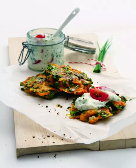 - Das Öl portionsweise in einer Pfanne erhitzen. Darin 8 Rösti portionsweise bei mittlerer Hitze von jeder Seite 2–3 Minuten braten. Den Frischkäsedip dazu servieren.