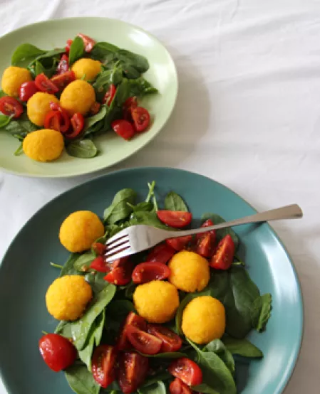 - Tomaten und Spinat vermischen, auf Tellern verteilen und die Polentabällchen daraufsetzen.